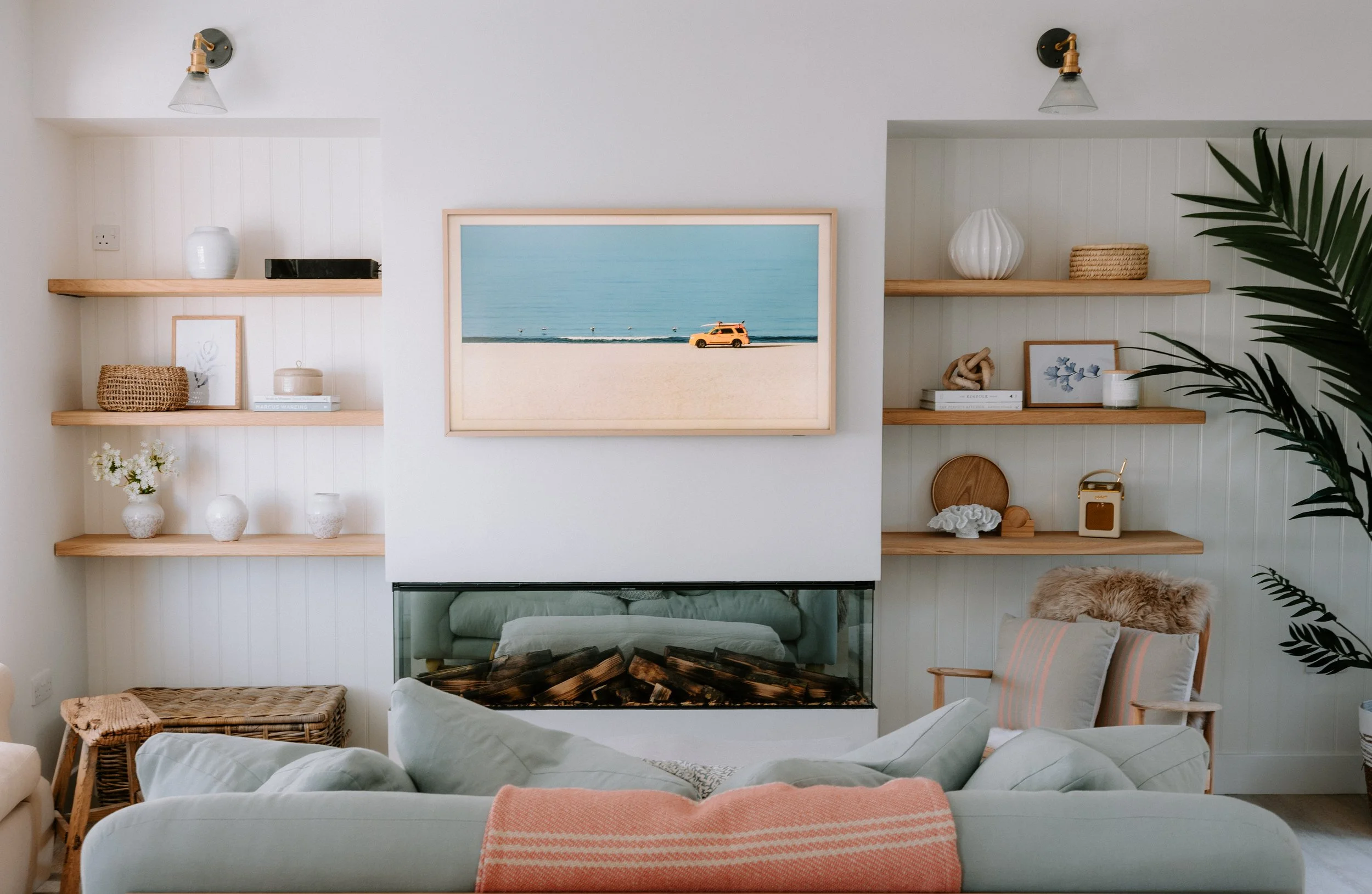 Living room with a cozy couch, fireplace, framed beach photograph, and built-in wooden shelves with decor and books.
