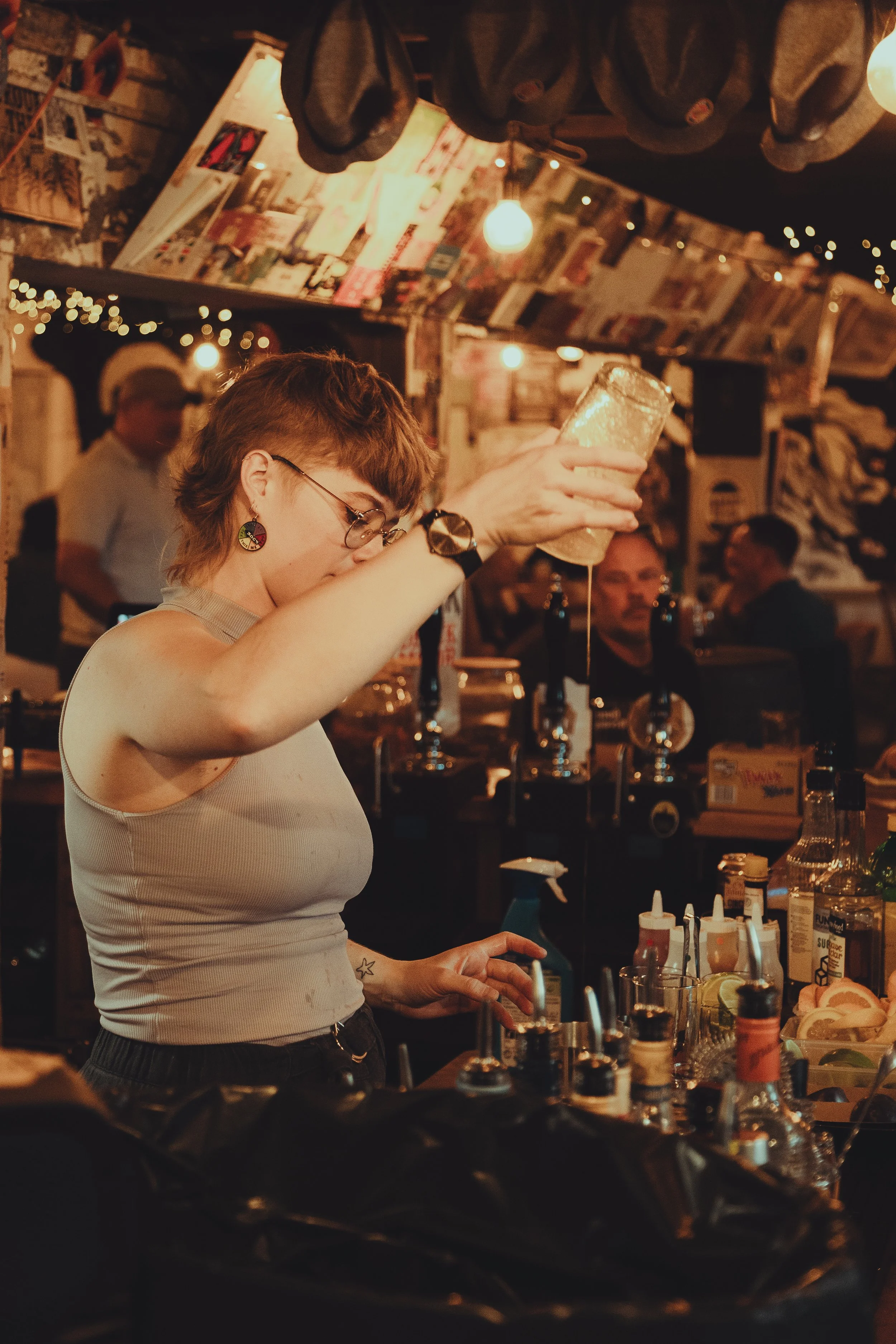 • A bartender with short hair, glasses, and colorful earrings pouring a drink in a dimly lit bar with bottles, glasses, and bar tools on the counter, and posters and lights decorating the background.